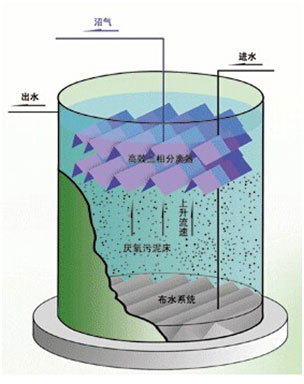 UASB反應(yīng)器的上部設(shè)置氣、固、液三相分離器,下部為污泥懸浮層區(qū)和污泥床區(qū)。